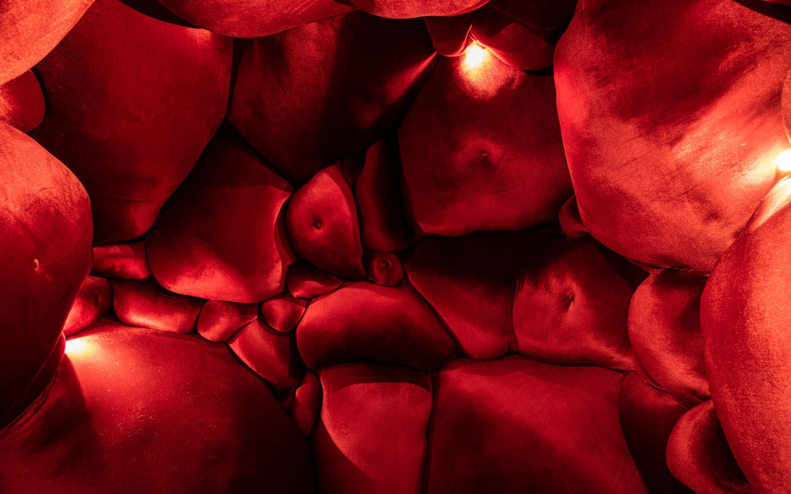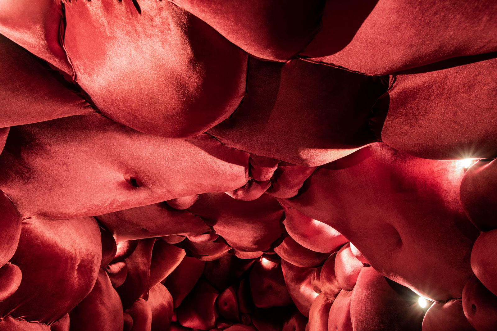 Natalie Clark’s resulting installation at The Container, Into the Curve, creates an immersive environment spectators can walk into. The entire space is saturated with madder red textiles, assembled with upholstery techniques, to create a tunnel of femininity. The shapes, round and curved, may recall female breasts or hips, or to the more sexually inclined, a vulva or a vagina. To others, the choice of the red fabric perhaps alludes to being trapped in internal organs, but also communicates empowerment and passion. Overall, the installation is very abstract and open to a variety of personal interpretations, but the sensory impact is exact and precise. To quote Clark, “I’m creating an immersion of the feminine nude form, an undulating upholstered interior installation, deep buttoned, curvaceous, figurative. Think bums, boobs, bellies of no specific gender. Soft and pliable, a human landscape; interactive, immersive, and universal—saturated in deep hues of madder red. I am responding to the influence of color imprinted on me. The elemental, emotional and universal symbolic use of color.”